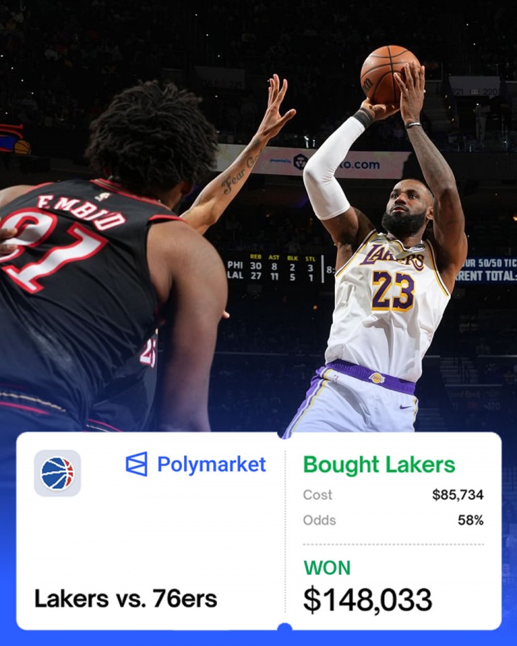 美媒Polymarket发推显示,本场赛前有球迷花了85,734美金赌注湖人赢球(赛前赢球概率58%),最终获利148,033美金。
