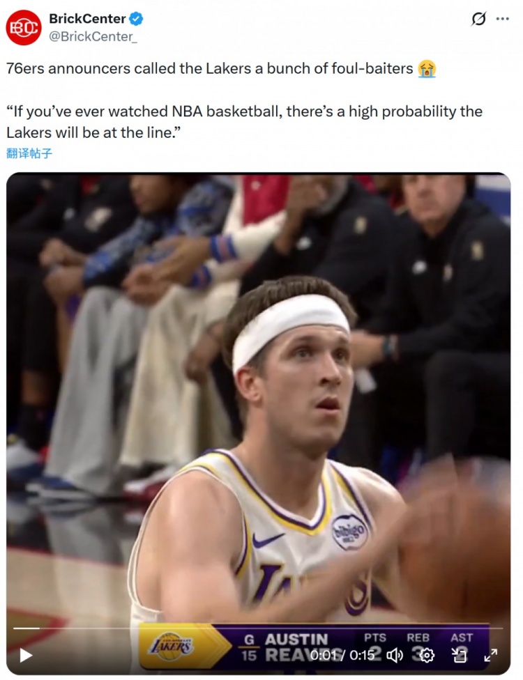 比赛末节在里夫斯的一次罚球过程中,76人解说员说道:“如果你看过NBA比赛,那么就知道湖人站上罚球线的概率非常高。”
