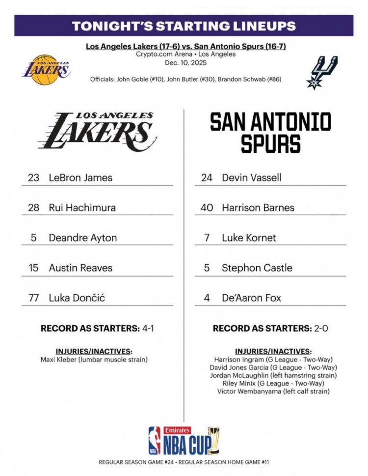 12月11日讯 NBA杯1/4决赛,湖人对阵马刺,赛前双方公布了本场首发。