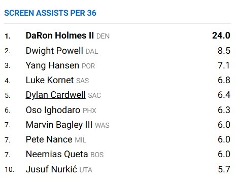 据NBA官网统计,杨瀚森本赛季每36分钟掩护助攻次数达到7.1次,高居联盟第三 ,仅次于达龙·霍姆斯和德怀特·鲍威尔。
