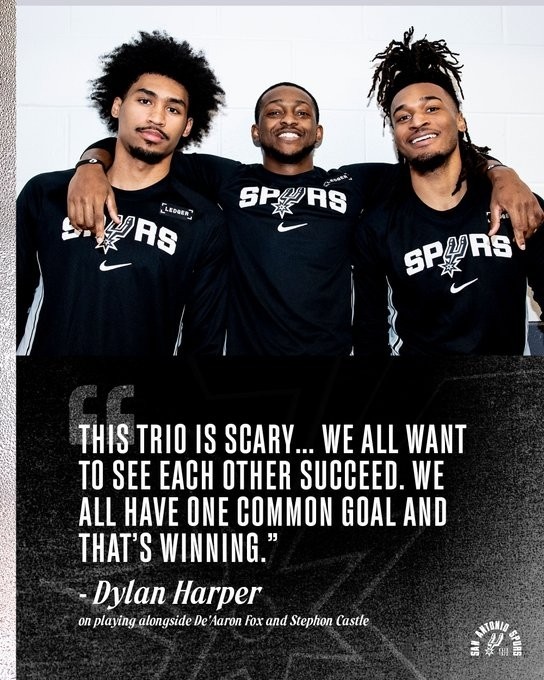 12月11日讯 马刺官方晒图:榜眼秀哈珀接受采访时谈到了自己和福克斯以及卡斯尔的外线三人组。