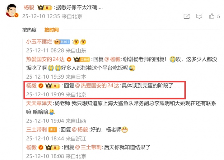 值得一提的是,杨毅在此条微博下面回复道:“具体谈到完蛋的阶段了……”