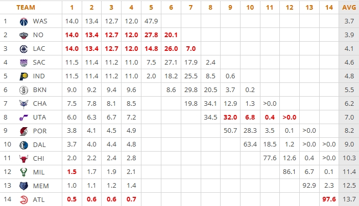 同时,快船前四概率52.1%,状元签概率14%,与奇才、鹈鹕并列联盟最高。
