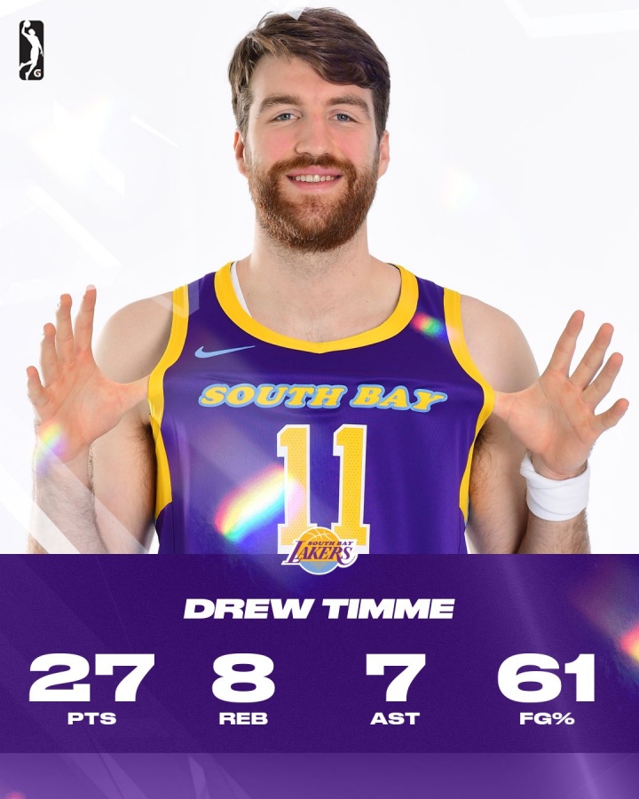 此役,湖人双向合同球员、南湾湖人内线德鲁·蒂米状态不俗,他全场18投11中,三分3中1、罚球4中2,砍下27分8篮板7助攻,但也出现了5次失误。